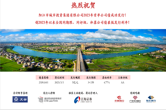2024年1月19日,市城投集團在深圳證券交易所成功發(fā)行“陽江市城市投資集團有限公司2024年面向?qū)I(yè)投資者非公開發(fā)行公司債券”。本期債券發(fā)行規(guī)模為5.5億元,期限為5(3+2)年,票面利率3.10%,全場認(rèn)購倍數(shù)超過4.8倍,是...